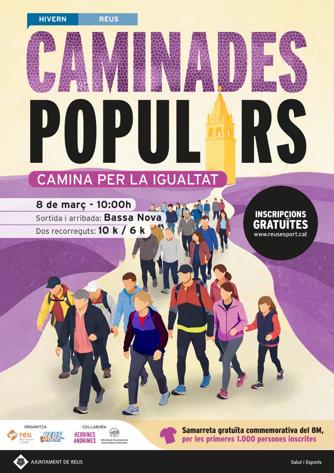 El calendari l’obrirà el proper 8 de març la Caminada Popular Reus Hivern – Caminada per la Igualtat de la mà de l’associació Heroïnes Anònimes i l'associació de Dones Blanca Almendro. Com que aquest any coincideix amb el mateix dia de la commemoració del Dia Internacional de la Dona s’ha volgut tenir un detall amb les persones participants, de manera que s’obsequiarà amb una samarreta a les primeres 1.000 persones inscrites.