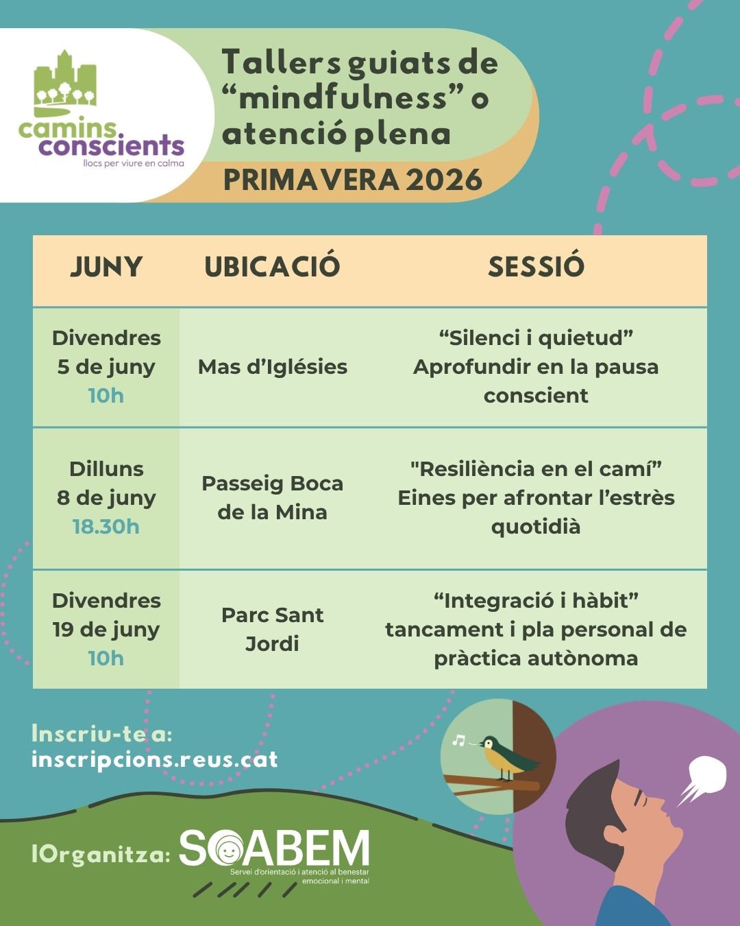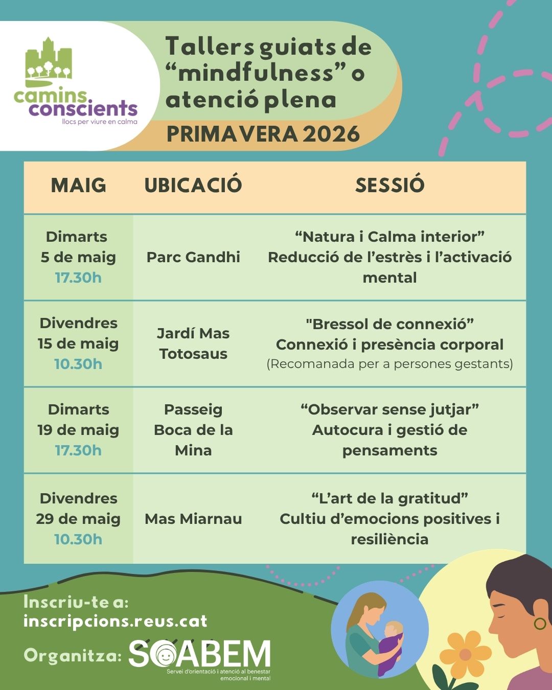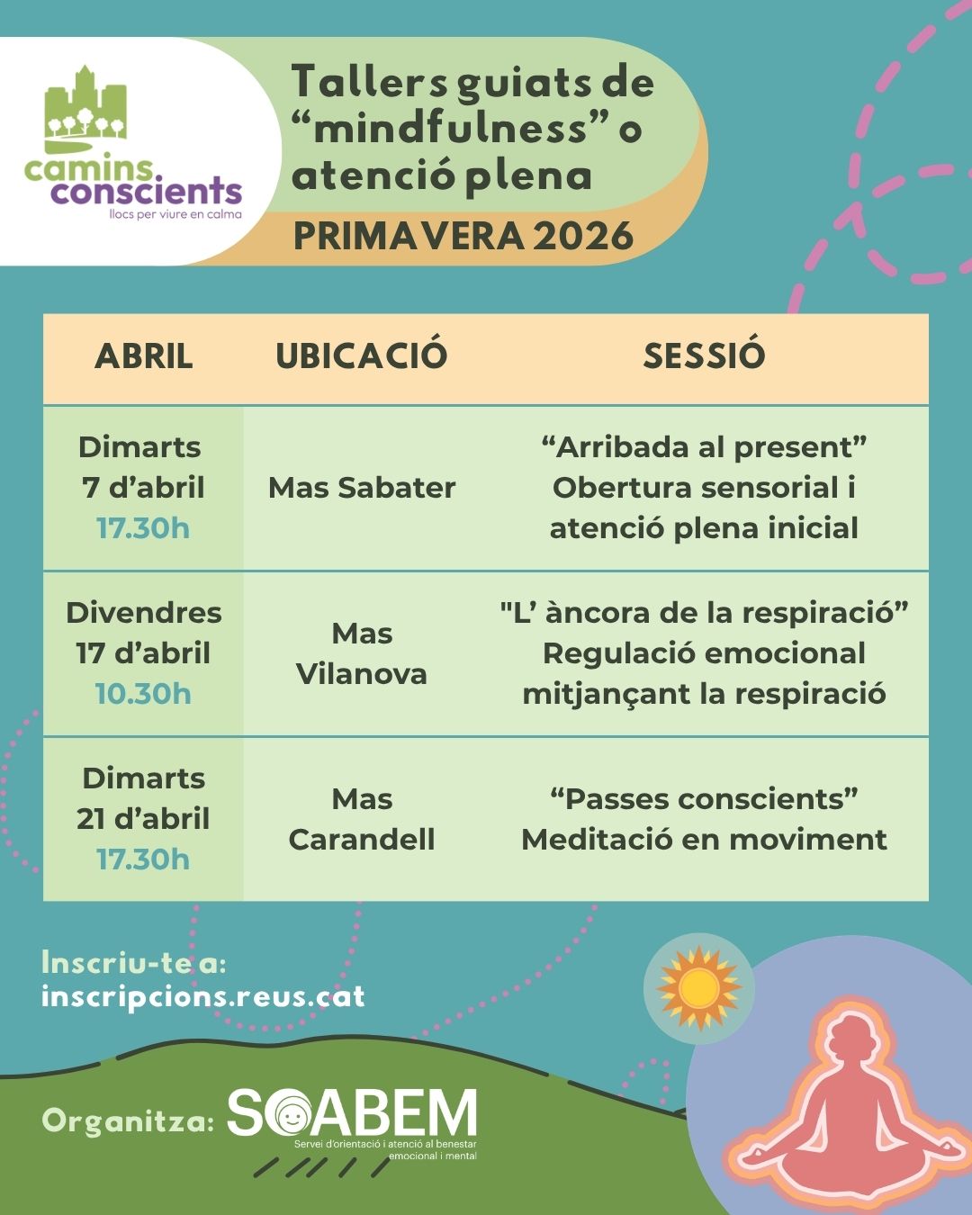 L’Ajuntament de Reus reforça aquesta primavera el projecte Camins Conscients amb la programació de nous tallers guiats de mindfulness o atenció plena, una proposta orientada a fomentar el benestar emocional de la ciutadania a través de la connexió amb la natura i la pràctica conscient en entorns naturalitzats.