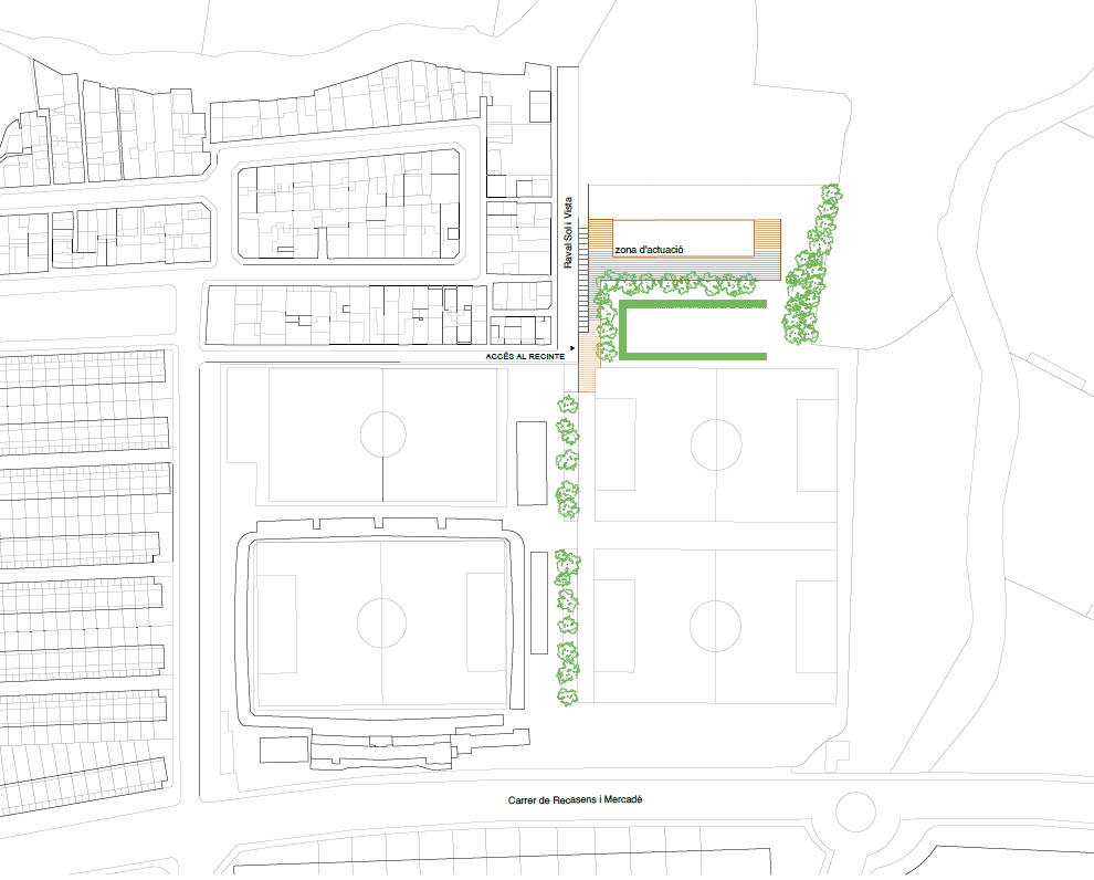 La nau comptarà amb espai d’emmagatzematge, un espai de vestidors i un taller. L’accés principal es farà des del Raval de Sol i Vista. L’alçada màxima de l’edifici serà de 6,5 metres per reforçar la integració urbanística al bari.