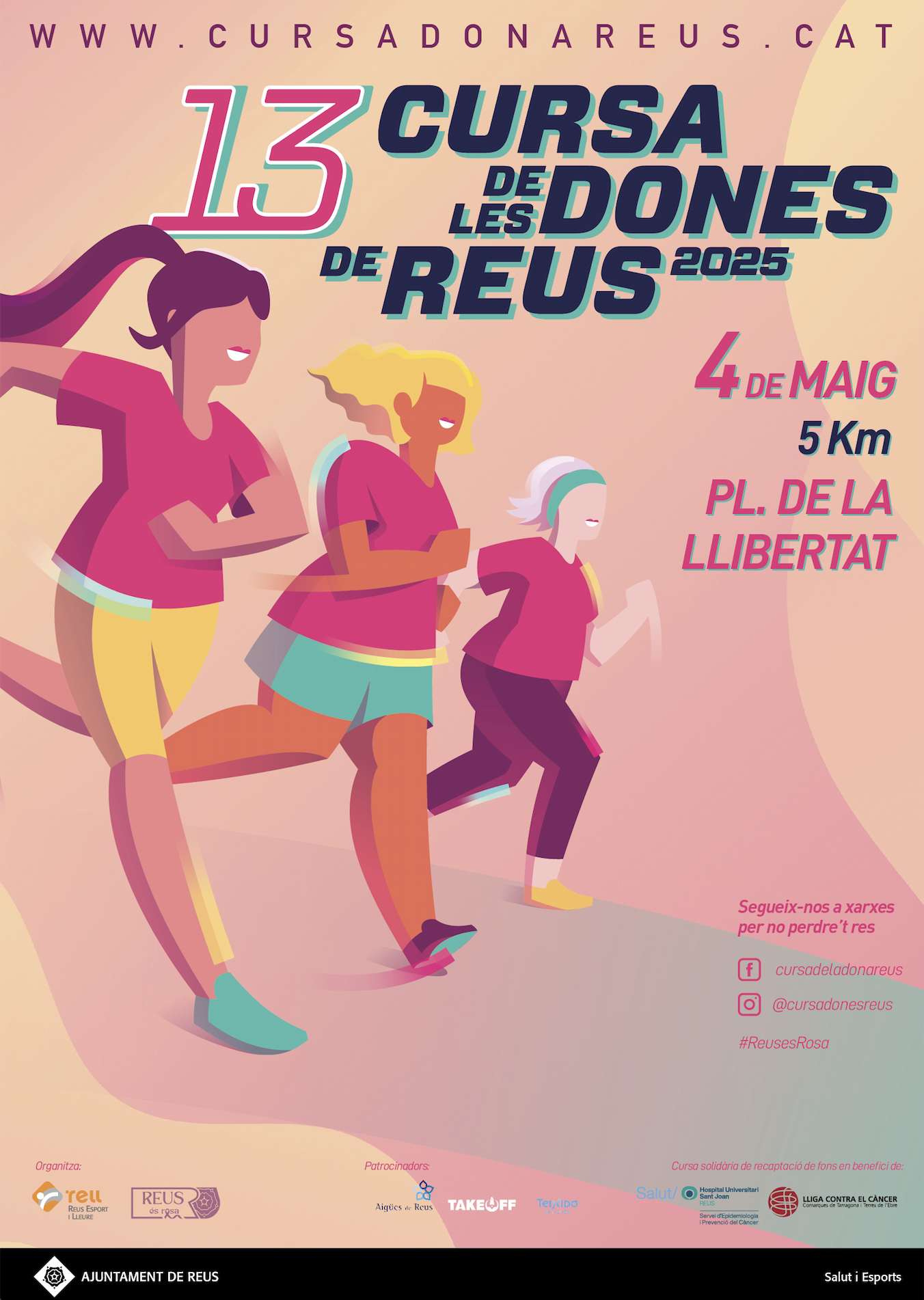 Ja estan obertes les inscripcions per a la 13a edició de la Cursa de les Dones de Reus que se celebrarà el diumenge 4 de maig de 2025. Aquesta cursa és l’activitat esportiva i solidària més multitudinària que es realitza a Reus. Amb sortida i arribada a la Plaça de la Llibertat, farà un recorregut de 5 quilòmetres pels carrers més emblemàtics de la ciutat.