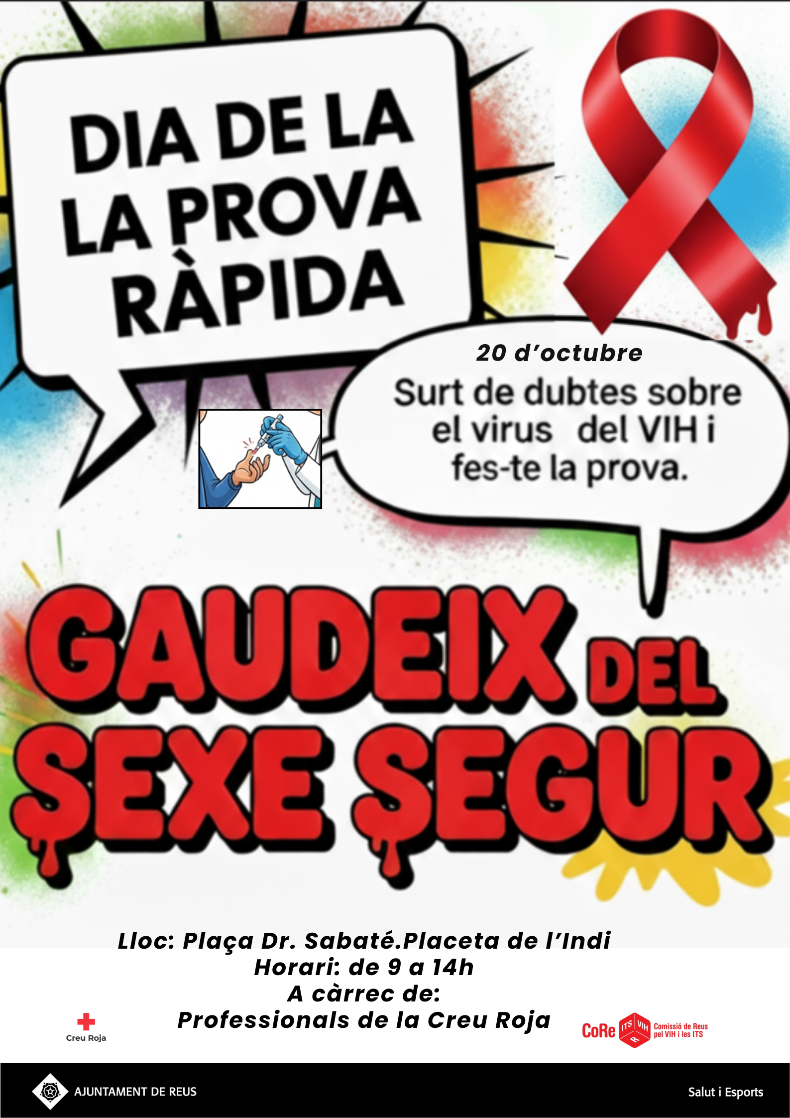 La Comissió de Reus per a la prevenció del VIH-Sida i de les Infeccions de Transmissió Sexual CoRe, de la qual en forma part la regidoria de Salut i Esports, portarà a terme el proper dilluns, 20 d’octubre, de les 9 a les 14 hores a la Plaça del Gegant Indi (plaça Dr. Sabater) proves ràpides del VIH/ SIDA. Una unitat mòbil de Creu Roja realitzarà les proves i des de la Comissió s’oferirà assessorament i repartiment de material divers a totes les persones que desitgin apropar-se. El lema d’aquesta acció és “Surt de dubtes, gaudeix del sexe segur”.